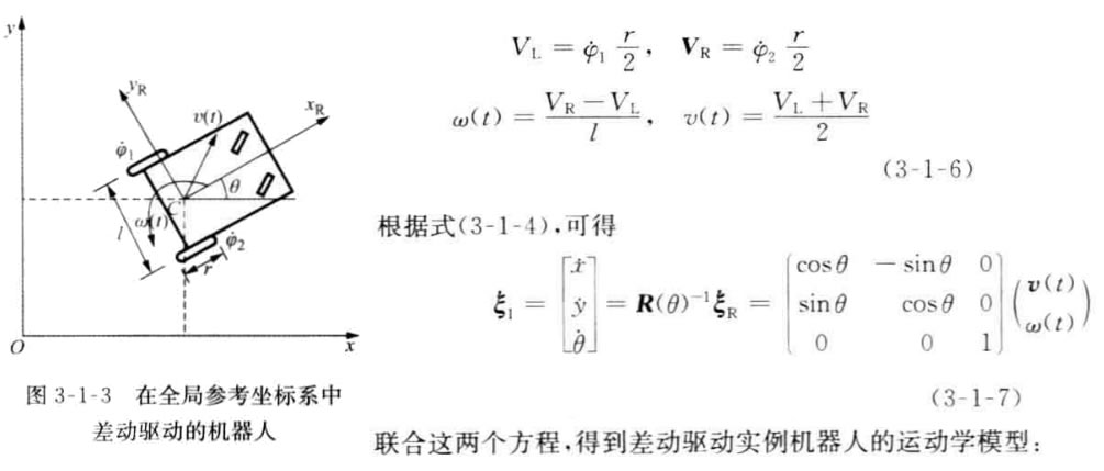先,我們討論如圖3-1-3所示的雙輪差速驅(qū)動(dòng)的移動(dòng)機(jī)器人的運(yùn)動(dòng)學(xué)模型, 即討論給定機(jī)器人的幾何特征和它的輪子速度后,機(jī)器人的運(yùn)動(dòng)方程。
