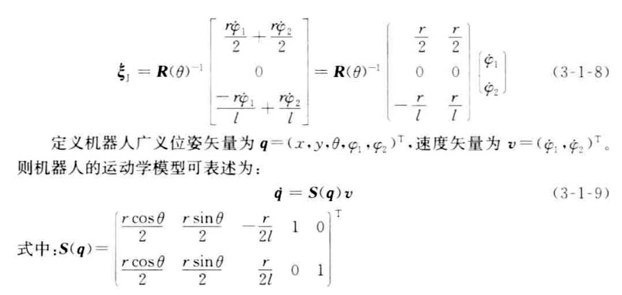 假定機(jī)器人在運(yùn)動(dòng)中質(zhì)心的線速度為v(t), 角速度為w(t), 左右兩輪的轉(zhuǎn)速分別為ψ和 中₂,機(jī)器人左右兩輪的運(yùn)動(dòng)速度分別為 VI, VR。給定r,1,θ, 以及根據(jù)圖3-1-3所示的幾 何關(guān)系,考慮到移動(dòng)機(jī)器人滿足剛體運(yùn)動(dòng)規(guī) 律,下面的運(yùn)動(dòng)學(xué)方程(3-1-6)成立。