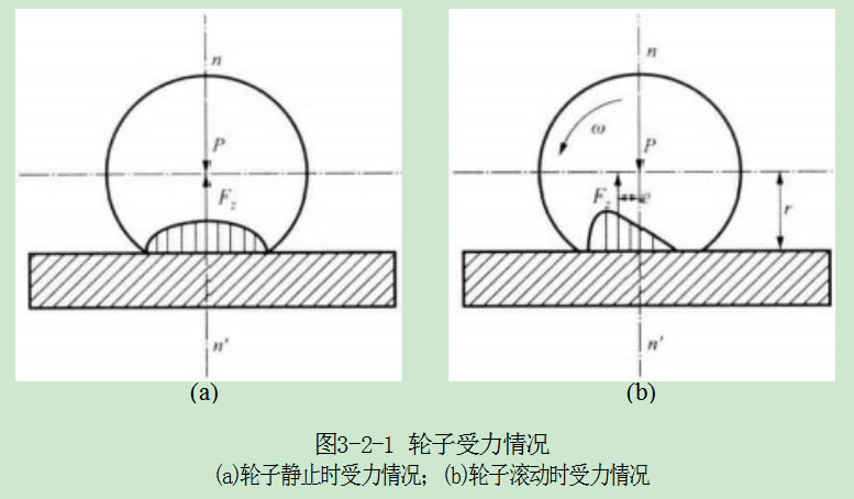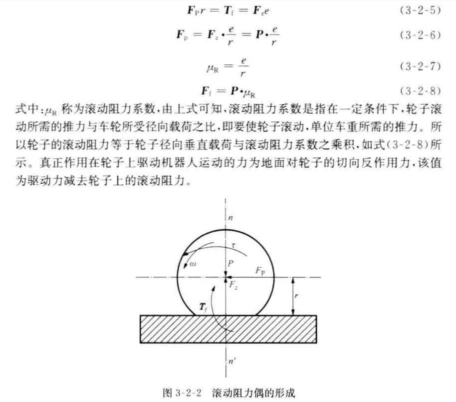 如果將法向反作用力F. 向后平移至通過(guò)輪子中心,與其垂線重合,則輪子在 地面上滾動(dòng)時(shí)的受力情況如圖3-2-2所示,出現(xiàn)一個(gè)附加的力偶矩T=F,e, 這個(gè) 阻礙車輪滾動(dòng)的力偶矩稱為滾動(dòng)阻力偶矩。由圖3-2-2可知,欲使輪子在地面上 保持勻速滾動(dòng),需要在輪軸上加一驅(qū)動(dòng)力矩r 或是加一推力Fp, 從而克服上述滾 動(dòng)阻力偶矩。相關(guān)數(shù)學(xué)關(guān)系如下所示。