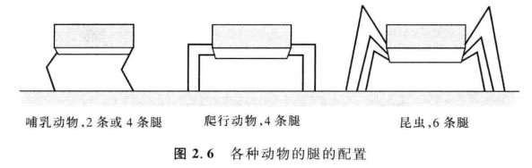 因為腿式機器人的發(fā)明是受到生物學上的啟發(fā),所以檢驗一下生物學上成功的 有腿系統(tǒng)是有益的。許多不同的腿的構造已經(jīng)在各種各樣的生物體中成功地存在 (圖2.6)。大型動物,如哺乳動物和爬行動物有4條腿,而昆蟲有6條腿或更多。某 些哺乳動物,僅靠2條腿行走的能力已經(jīng)很出色。尤其是人類,平衡能力已經(jīng)進展到 甚至可用單腿進行跳躍的水平①。這種異常的機動性是以很高代價得來的:為保持平 衡而使用更復雜的主動控制 。