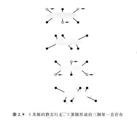 相反,3條腿的動物假定它能保證其重心處在地面接觸的三腳區(qū)內(nèi),它就能夠展 示靜止、穩(wěn)定的姿態(tài)。如3條腿的凳子所展現(xiàn)那樣,靜止穩(wěn)定性意味著不需要運動而 保持平衡。在沒有傾覆力時,稍微偏離穩(wěn)定(比如輕輕推凳子)會被動地予以校正而 趨向穩(wěn)定的姿態(tài)。 但是為了行走,機器人需要能夠抬腿。為了能達到靜態(tài)行走,機器人至少要有4 條腿,一次移動一個。而對于6條腿的情況,就有可能設計出一種步態(tài),按此,腿的靜 態(tài)穩(wěn)定三腳區(qū)總是與地面接觸(圖2.9)。