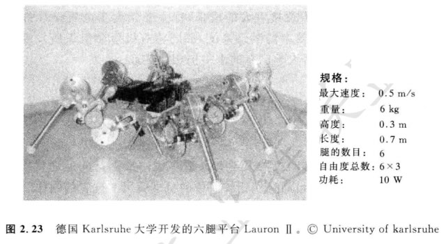 由于行走期間的靜態(tài)穩(wěn)定性,六腿結(jié)構(gòu)在移動機器人學中已經(jīng)很流行(圖2.23 和圖1.3),因而降低了控制的復雜性。在大多數(shù)情況下,各條腿有3個自由度,包括