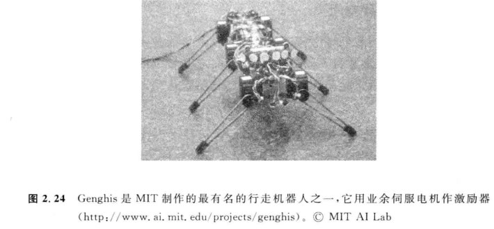 臀部彎曲、膝蓋彎曲和臀部外展(圖2.7)。Genghis 是一個商業(yè)上已可用的有6條腿 的業(yè)余機器人,各腿有業(yè)余伺服電機所提供的2個自由度(圖2.24)。這樣的機器人 僅由臀部彎曲和臀部外展組成,在粗糙的地形中機動性較差,但在平地上則表現(xiàn)很 好。因為它是由直腿和伺服電機簡捷裝配而成,所以機器人業(yè)余愛好者可以很容易 地制作這種機器人。
