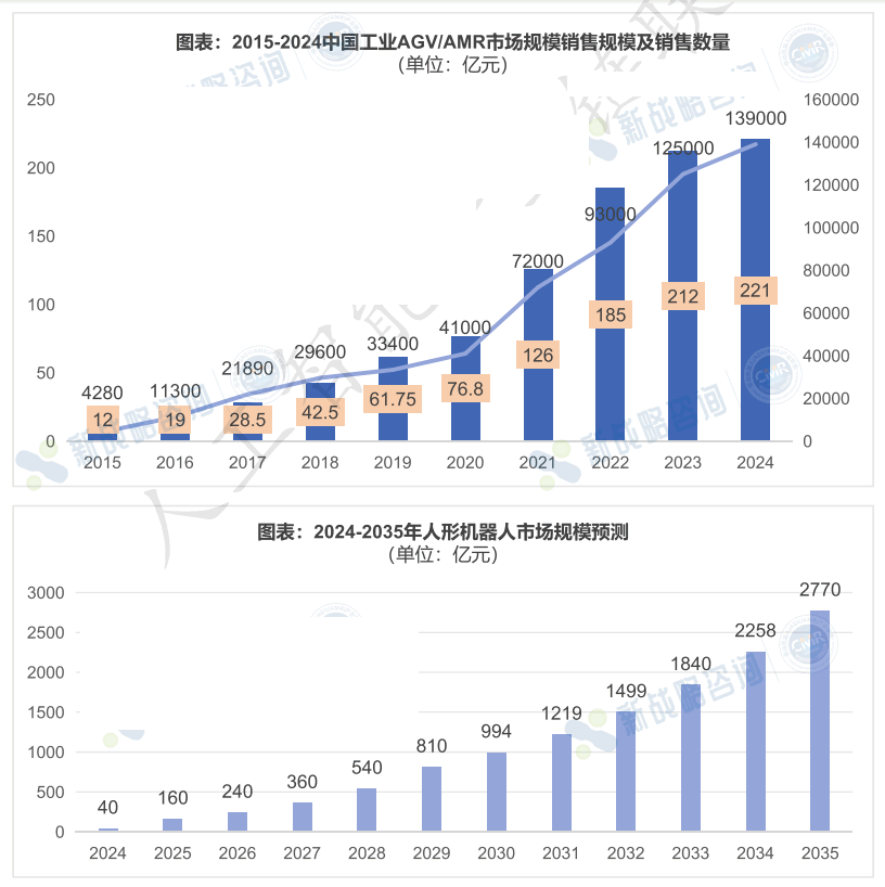 根據(jù)新戰(zhàn)略移動機器人產(chǎn)業(yè)研究所統(tǒng)計, 2024年ZG工業(yè)應(yīng)用移動機器人銷售規(guī)模為221億, 同比增長4.25%; 銷售數(shù)量為139000臺, 同比增長1 1.2% ZG市場人形機器人出貨量超2800臺, 市場規(guī)模超20億; 清潔及環(huán)衛(wèi)機器人累計出貨超12900臺 (不含小型家用墻面清潔泳池清潔機器人) , 市場銷售規(guī)模約 27.6億元。 2024年, ZG智能移動機器人整體市場已突破300億元。