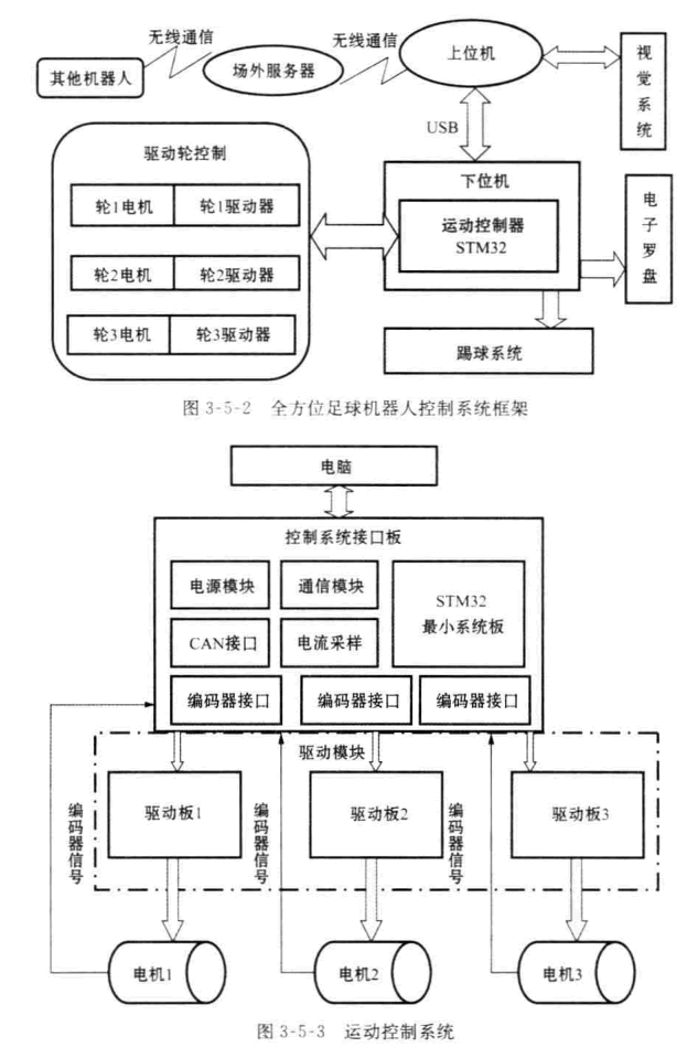 運動控制系統(tǒng)由通信模塊、電源模塊、控制模塊和電機驅(qū)動模塊組成。一塊主 控制板(STM32) 控制3塊驅(qū)動電路,分別驅(qū)動3個全方位輪,實現(xiàn)3軸聯(lián)動。當(dāng)機器人工作時,通信模塊負責(zé)從PC 機接收指令數(shù)據(jù),包括3個輪子的速度和是否踢 球判斷以及踢球力度。控制模塊將3個輪子的速度發(fā)送到運動控制模塊,并產(chǎn)生 一個踢球信號控制氣動踢球系統(tǒng)產(chǎn)生踢球動作。運動控制模塊則控制著3個輪子 的速度,并且將通過閉環(huán)采集到的電機碼盤信息獲得的3個輪子的速度反饋回PC 機,供機器人上層策略算法使用。其結(jié)構(gòu)圖如圖3-5-3。通信模塊和運動控制模塊的CPU采用的是 STM32F103CB。
