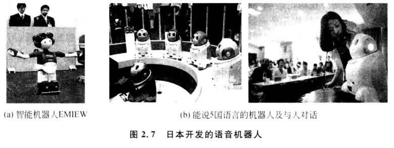日本日立公司也研制了一臺智能機器人EMIEW, 它的個頭和小孩一樣,依靠輪子移 動,如圖2.7(a)所示。由于身上裝有數(shù)碼相機和雷達探測器,它可以自動地躲避障礙物。 同時它的詞匯儲備量達到100多個,能夠?qū)σ恍┖唵蔚穆曇糁噶钭龀龇磻,并且還能夠 和人進行簡單的對話交流,甚至播報天氣預報等。第二代 EMIEW2 機器人可以通過無 線電裝置接收指令,然后毫不費力地在辦公室之間來回奔波,為辦公室人員跑腿。它站 立時身高大約為31.5英寸,體重為29磅。它能夠?qū)φ系K物應付自如,對人的語音做出 回應,并且一次充電后即可工作1小時。此外,能說5國語言的機器人及與人對話的機 器人也已經(jīng)誕生了,如圖2.7(b) 所示。在我國舉辦的日語演講大賽現(xiàn)場上,參加比賽的 選手以及日語院校的學生不但與該機器人進行了交流互動,而且該機器人還獻上了許多 精彩舞蹈和歌曲。