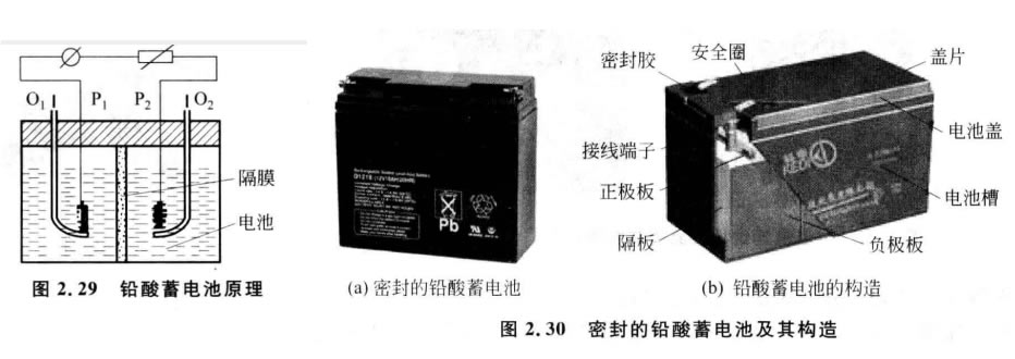 1859年,法國人普蘭特發(fā)明了鉛酸蓄電池,至今已有 150多年的發(fā)展歷程。鉛酸蓄電池在理論研究、產(chǎn)品種類 及品種、產(chǎn)品電氣性能等方面都得到了長足的進(jìn)步,在交 通、通信、電力、軍事、航海、航空等各個領(lǐng)域,鉛酸蓄電池都 起到了不可缺少的重要作用。鉛酸蓄電池的原理和構(gòu)造如 圖2.29和圖2.30所示,它是一種電極由鉛及其氧化物制成,電解液是硫酸溶液的蓄電池。鉛酸蓄電池在荷電狀態(tài)下,正極的主要成分是二氧化 鉛,負(fù)極主要成分為鉛。在放電狀態(tài)下,正負(fù)極的主要成分均為硫酸鉛。