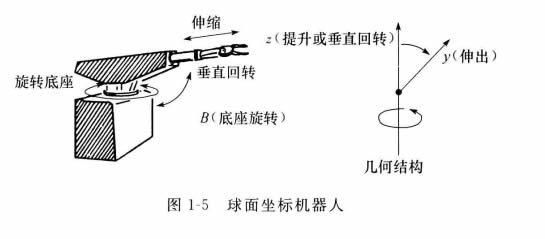 這種機(jī)器人如圖1-5所示。它像坦克的炮塔一樣,機(jī)械手能夠做里外伸縮移動、在垂直平面上垂直回轉(zhuǎn)以及在水平平面上繞底座旋轉(zhuǎn)。因此,這種機(jī)器人的工作包跡形成球面 的一部分,并被稱為球面坐標(biāo)機(jī)器人。