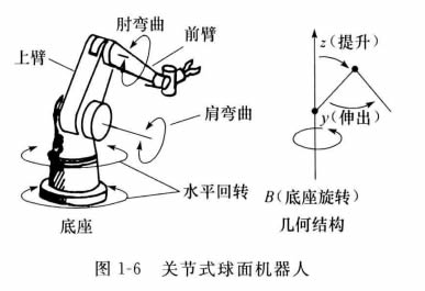 這種機(jī)器人主要由底座(或軀干)、上臂和前臂構(gòu)成。上臂和前臂可在通過底座的垂直平面上運動,如圖1-6所示。在前臂和上臂間,機(jī)械手有個肘關(guān)節(jié);而在上臂和底座間, 有個肩關(guān)節(jié)。在水平平面上的旋轉(zhuǎn)運動,既可 由肩關(guān)節(jié)進(jìn)行,也可以繞底座旋轉(zhuǎn)來實現(xiàn)。這 種機(jī)器人的工作包跡形成球面的大部分,稱為 關(guān)節(jié)式球面機(jī)器人。
