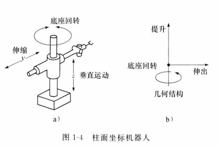 柱面坐標(biāo)機(jī)器人主要由垂直柱子、 水平手臂(或機(jī)械手)和底座構(gòu)成。水平 機(jī)械手裝在垂直柱子上,能自由伸縮, 并可沿垂直柱子上下運動。垂直柱子安 裝在底座上,并與水平機(jī)械手一起(作 為 一個部件)能在底座上移動。這樣, 這種機(jī)器人的工作包跡(區(qū)間)就形成一 段圓柱面,如圖1-4所示。因此,把這種機(jī)器人叫做柱面坐標(biāo)機(jī)器人。
