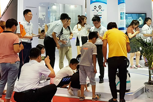 智能語音對話機器人正在展會上和小朋友對話互動呢,這是機器人展會現(xiàn)場,小朋友和機器人都很認真對話交流呢...