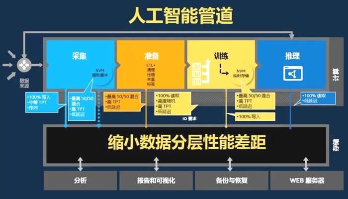 “工欲善其事,必先利其器”,要想發(fā)揮出AI人工智能技術(shù)的大威力,需要企業(yè)構(gòu)建強(qiáng)有力的IT基礎(chǔ)設(shè)施。這個(gè)設(shè)施不僅需要強(qiáng)有力的處理器、FPGA、GPU,也需要G性能的存儲(chǔ)設(shè)備,否則就會(huì)如普通電腦一般,因?yàn)闄C(jī)械硬盤(pán)傳輸速度慢,尋找數(shù)據(jù)的時(shí)間長(zhǎng),往往會(huì)成為整個(gè)系統(tǒng)性能的瓶頸,即使是SATA/PCIe NAND SSD,很多時(shí)候也跟不上AI數(shù)據(jù)處理的需求。倪錦峰先生介紹到,無(wú)論用于哪個(gè)行業(yè),人工智能的工作實(shí)際上主要由采集、準(zhǔn)備、訓(xùn)練和推理四部分組成。每個(gè)部分需要讀寫(xiě)不同類型的數(shù)據(jù),工作負(fù)載也不盡相同,將給存儲(chǔ)設(shè)備帶來(lái)較大的挑戰(zhàn)。
