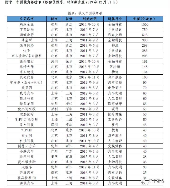 2019年中國(guó)獨(dú)角獸企業(yè)數(shù)量達(dá)到218家,總估值7964億美元,平均估值36.5億美元,超過(guò)100億美元(含)的超級(jí)獨(dú)角獸企業(yè)共7家