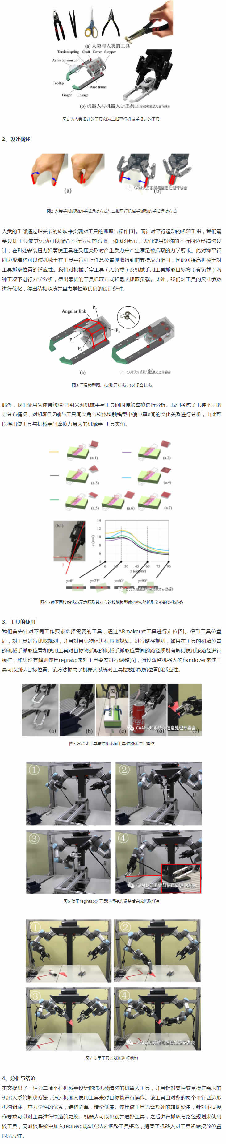 現(xiàn)代自動化生產(chǎn)中要求機器人系統(tǒng)具備一定柔性以適應變種變量的生產(chǎn)需求。例如在機器人分揀及組裝中,機器人需要快速處理各式不同的物體。使機器人系統(tǒng)可以穩(wěn)定并且低成本的操控多種目標物體是實現(xiàn)新一代G效自動化生產(chǎn)的重要研究目標。目前機器人系統(tǒng)針對多種物體的操作,主要通過機械手/手指更換設備或多功能機械手來實現(xiàn)[1][2]。然而機械手/手指更換設備需要部署輔助控制設備和外部能源供給,這增加了系統(tǒng)的復雜度。同時,設備的控制與供能需要引入電纜或氣管,這會對機械臂的自由靈活運動產(chǎn)生干擾。此外,多功能機械手僅可適用于一定范圍的操作任務。對此,我們提出了讓機器人使用不同工具來操作多樣化目標物的方法。這里提到的工具并不是機器人學中對終端執(zhí)行器的稱呼,而是同人類使用的鑷子,剪刀等工具一樣的可以被機械手直接控制的工具。此工具為復雜的變種變量的操作任務提供了一項有效的解決方案,它有如下特征:(1) 通過機械機構實現(xiàn)機械手到工具的動力傳遞,無需外部控制及供能;(2)結構緊湊,對機器人的避障路徑規(guī)劃影響J。(3) 通過設計不同的工具先端實現(xiàn)可以對多種任務進行有效配適,在更換工具時僅需要對目標工具進行一次抓;(4)純機械機構設計,成本低廉,可靠性強。