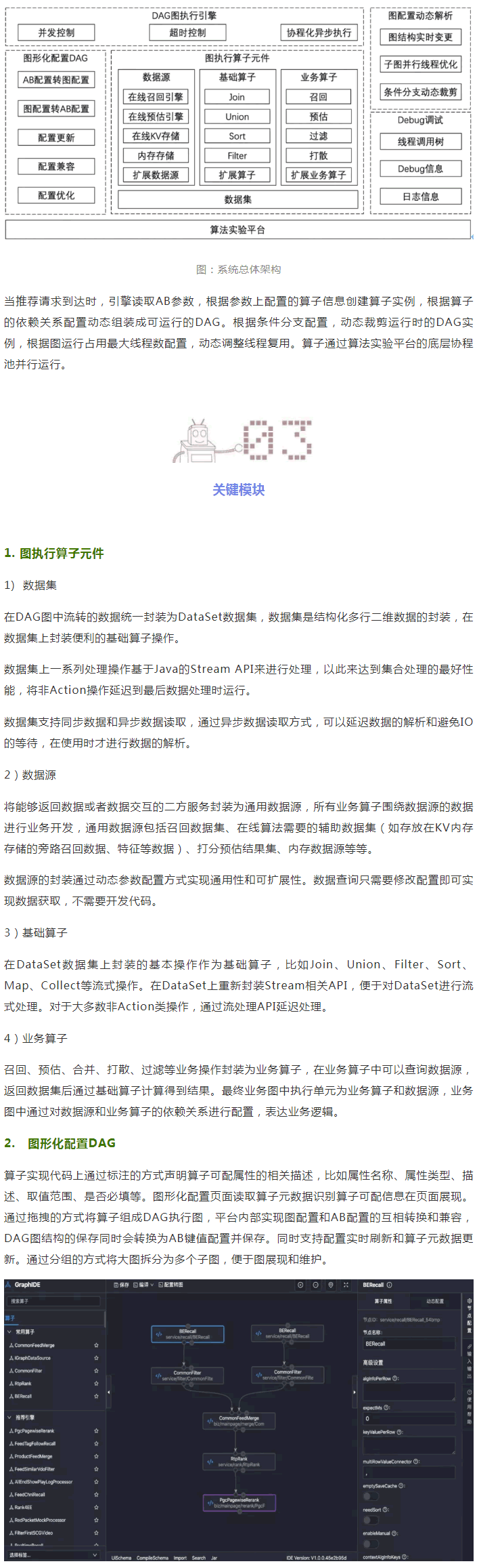 系統(tǒng)總體結(jié)構(gòu)如下圖所示:分成五個(gè)主要的模塊(圖執(zhí)行算子元件、圖形化配置DAG、圖配置動(dòng)態(tài)解析、DAG圖執(zhí)行引擎、Debug調(diào)試)。