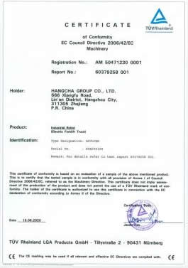 從技術層面看,工業(yè)叉車已從人工操控的機械產(chǎn)品向電子信息系統(tǒng)控制的智能產(chǎn)品轉變,對工業(yè)叉車的智能性和安全性提出了更G的要求。在認證機構萊茵的大力支持和指導下,杭叉集團協(xié)同三方技術力量,嚴格按照技術評審、關鍵零部件選型、樣機初檢、技術整改、現(xiàn)場試驗、資料整改要求,逐項攻克基礎性能、功能安全、電氣安全、風險評估中的技術難點,終獲得證書。