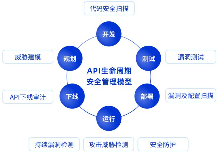 其次,API在整個業(yè)務(wù)生命周期當(dāng)中變化非?欤珹PI實現(xiàn)邏輯一旦發(fā)生變化,很容易引入新的風(fēng)險。因此,從API全生命周期來考慮API安全,圍繞規(guī)劃、開發(fā)、測試、部署、運行到下線的每一個環(huán)節(jié)加強安全建設(shè)顯得尤為重要。