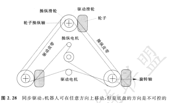 在室內(nèi)移動(dòng)機(jī)器人應(yīng)用中,同步驅(qū)動(dòng)結(jié)構(gòu)(圖2.28)是一種流行的輪子裝配,也是 一個(gè)令人很感興趣的結(jié)構(gòu)。因?yàn)樗m然有3個(gè)驅(qū)動(dòng)和操縱輪,可是總共只用了2個(gè)電機(jī)。一個(gè)平移電機(jī)設(shè)置3個(gè)輪子一起的速度; 一個(gè)操縱電機(jī),使所有輪子繞著它們 各自的垂直操縱軸一起旋轉(zhuǎn)。但要注意的是,輪子是相對(duì)于機(jī)器人的底盤(pán)受操縱的, 所以,沒(méi)有直接方法重新設(shè)定機(jī)器人底盤(pán)的方向。實(shí)際上,由于凹凸不平輪胎的滑動(dòng),在整個(gè)時(shí)間里底盤(pán)方向一定會(huì)漂移,造成旋轉(zhuǎn)的航位測(cè)定誤差。