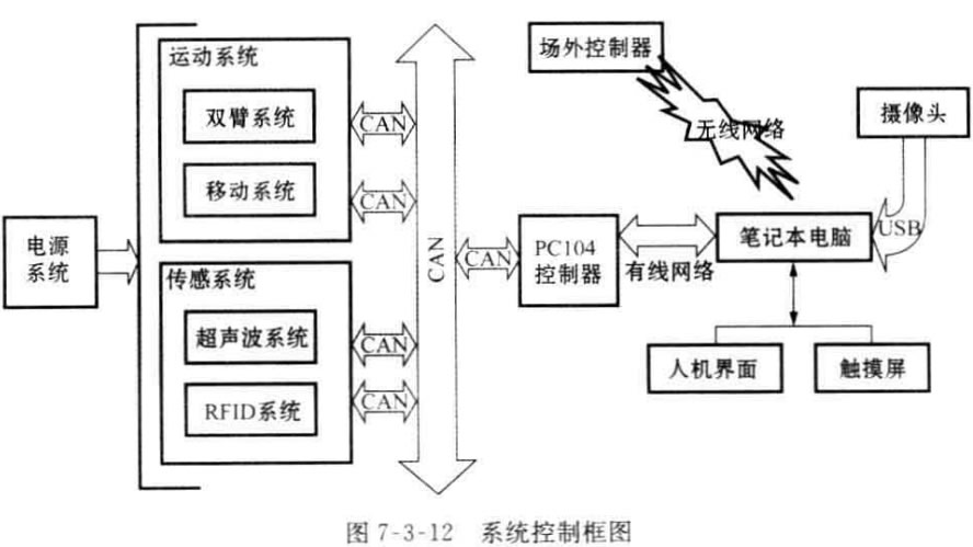 展廳機(jī)器人系統(tǒng)各硬件模塊主要由CAN 總線連接,通過統(tǒng)一的CAN總線協(xié)議將各模塊簡單地加載到系統(tǒng)中。系統(tǒng)主要由電源系統(tǒng)、運(yùn)動控制系統(tǒng)、傳感系統(tǒng)等組成,其中運(yùn)動控制系統(tǒng)包括雙臂系統(tǒng)及移動系統(tǒng),傳感器系統(tǒng)包括超聲波系統(tǒng)、RFID定位系統(tǒng)、視覺系統(tǒng)組成。具體結(jié)構(gòu)由圖7-3-12所示。