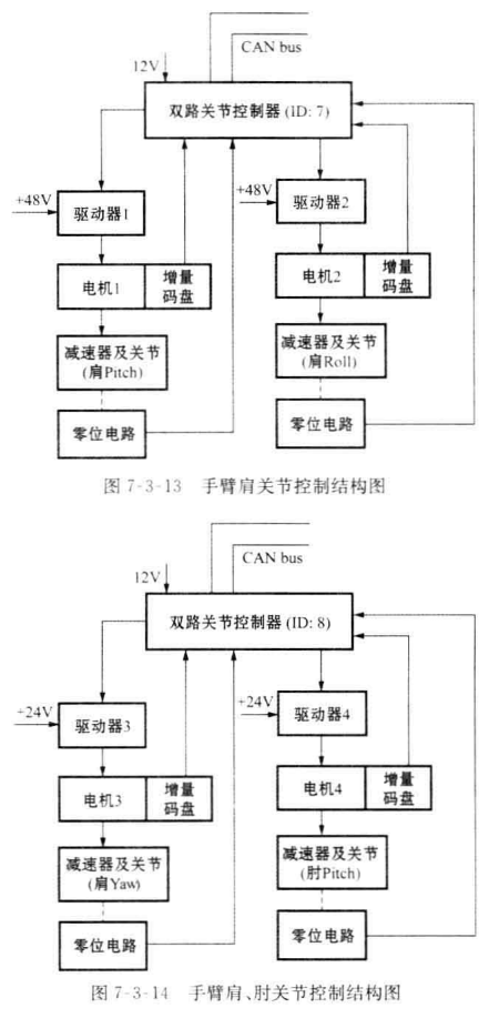 手臂各關(guān)節(jié)控制電路采用分布式控制系統(tǒng),各關(guān)節(jié)控制器(主 MCU 是 TMS320LF2407)由CAN 總線相連(CAN2.0-A 版本)?刂浦芷跒5m (即上位機(jī) 與 所 有 關(guān) 節(jié) 控 制 器 通 信 一 遍 , 再 加 一 定 裕 度 后 的 時(shí) 間 ) 。 各 關(guān) 節(jié) 控 制 電 路 結(jié) 構(gòu) 如 圖7 - 3 - 13、圖7 - 3 - 14及圖7 - 3 - 15所示。