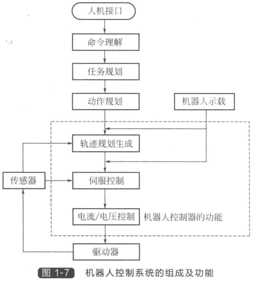 對(duì)于一個(gè)具有高度智能的機(jī)器人,它的控制系統(tǒng)實(shí)際上包含了“任務(wù)規(guī)劃” “動(dòng)作規(guī)劃”“軌跡規(guī)劃”和基于模型的 “伺服控制”等多個(gè)層次,如圖1-7所示。 機(jī)器人先要通過(guò)人機(jī)接口獲取操作者的 指令,指令的形式可以是人的自然語(yǔ)言, 或者是由人發(fā)出的專用的指令語(yǔ)言,也可 以是通過(guò)示教工具輸入的示教指令,或者 鍵盤(pán)輸入的機(jī)器人指令語(yǔ)言以及計(jì)算機(jī)程