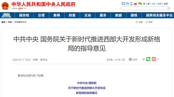 5月17日,、國務(wù)院發(fā)布了一份將改寫東西格局的重磅文件——《關(guān)于新時(shí)代推進(jìn)西部大開發(fā)形成新格局的指導(dǎo)意見》(下稱《意見》),強(qiáng)化舉措推進(jìn)西部大開發(fā)形成新格局。