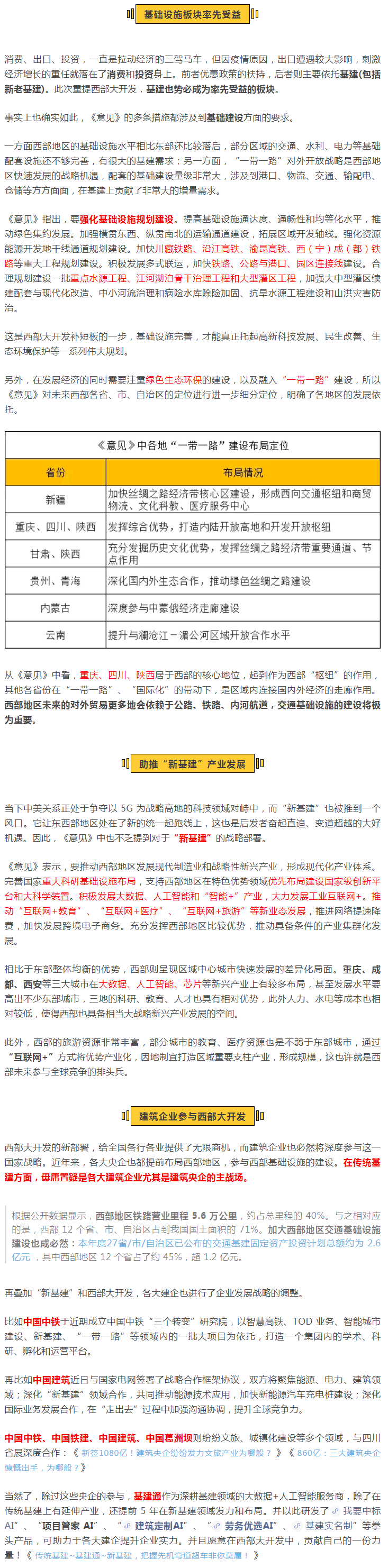 《意見》從推動(dòng)G質(zhì)量發(fā)展、加大西部開放力度、加大美麗西部建設(shè)力度、深化重點(diǎn)L域改革等七個(gè)方面提出了 36 條舉措,涉及政策、基建、產(chǎn)業(yè)和規(guī)劃等,對(duì)新時(shí)代推進(jìn)西部大開發(fā)形成新格局作出了部署,因此也被稱為“新的西部大開發(fā)戰(zhàn)略”。