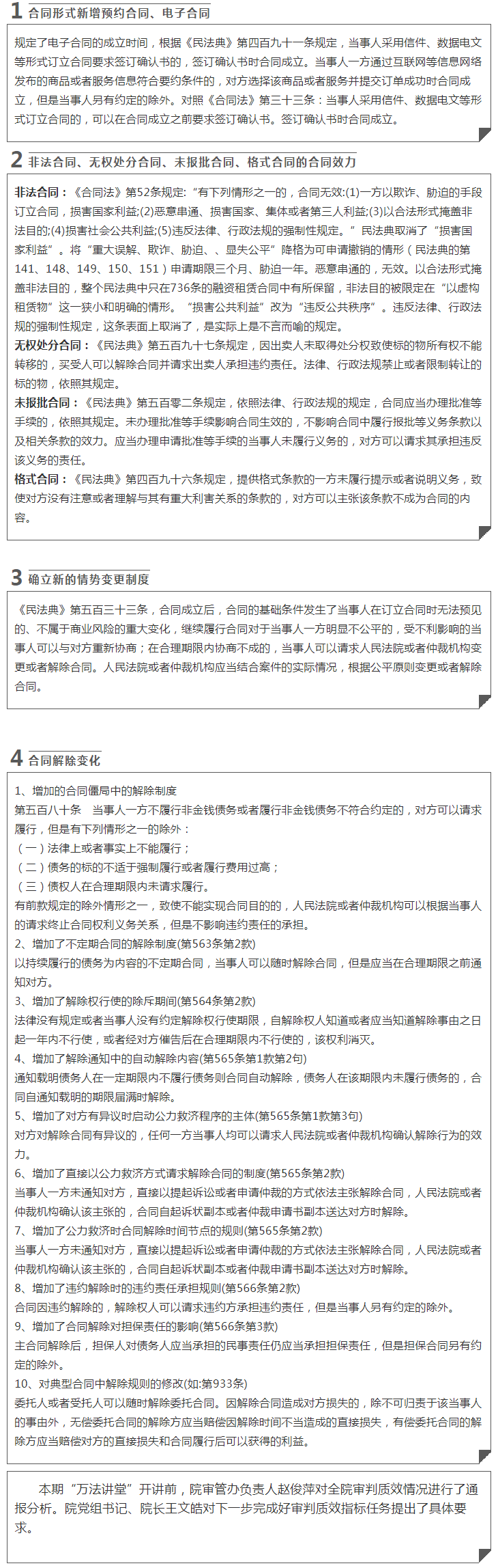 法官助理李洋通過(guò)對(duì)比民法典《合同編》與現(xiàn)行《中華人民共和國(guó)合同法》等新舊法律條文,解讀了《民法典》編纂中對(duì)原《合同法》訂立規(guī)則相關(guān)法條的完善和創(chuàng)新之處,并歸納總結(jié)出九大重大變化,為參會(huì)人員理解民法典合同編內(nèi)容提供了理論支撐和觀點(diǎn)參考。