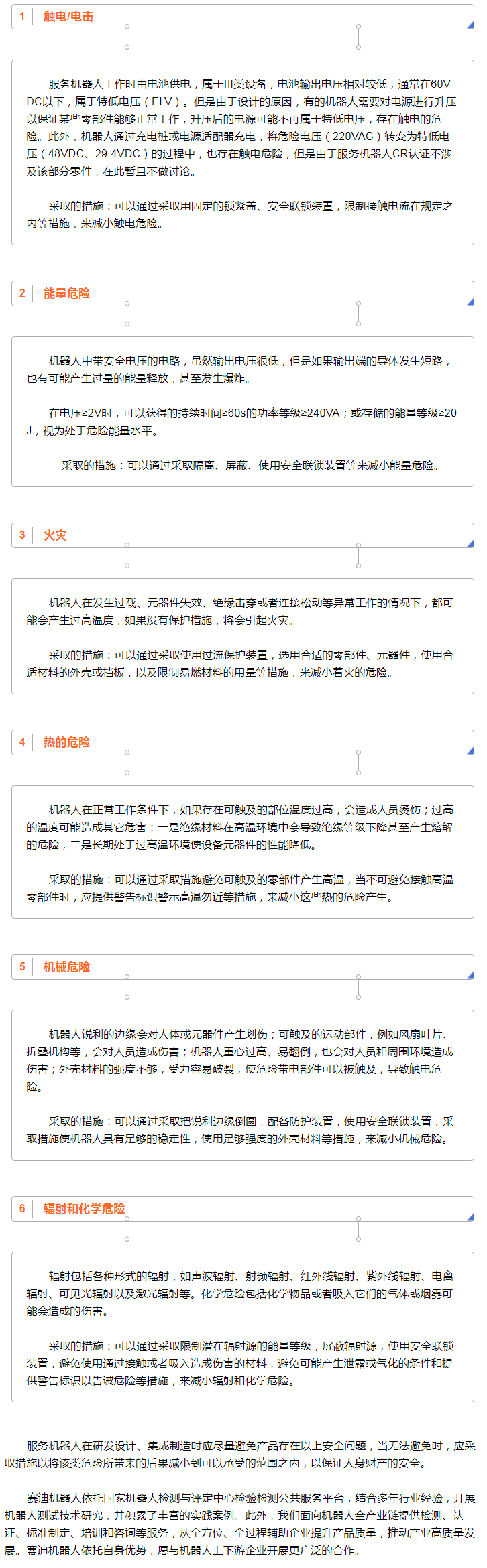 GB 4943.1-2011涵蓋的服務(wù)機(jī)器人潛在危險(xiǎn)有:電擊、與能量有關(guān)的危險(xiǎn)、著火、與熱有關(guān)的危險(xiǎn)、機(jī)械危險(xiǎn)、輻射、化學(xué)危險(xiǎn)等。不同的服務(wù)機(jī)器人,由于設(shè)計(jì)和使用場所的不同,各自潛在的主要危險(xiǎn)類型不一樣,需要根據(jù)實(shí)際情況進(jìn)行判斷。