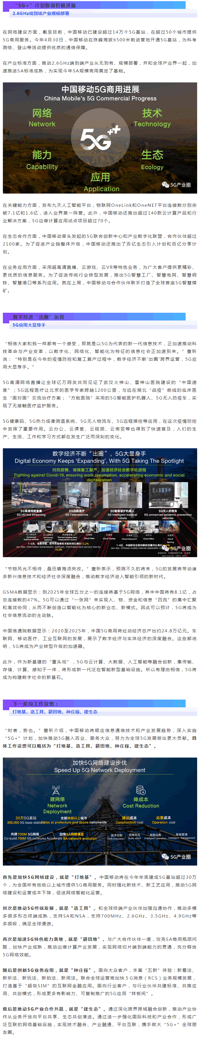中國移動將通過“打地基、造工具、耕田地、種莊稼、建生態(tài)”,深入實施“5G+”計劃,加快推動5G融入百業(yè)、服務大眾。