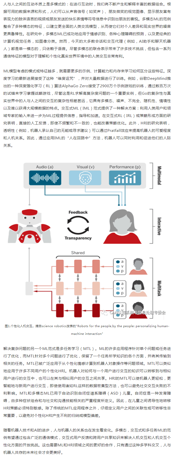 人機(jī)交互(Human-Robot Interaction)是一個(gè)多學(xué)科的L域,旨在理解和開發(fā)支持機(jī)器人與人類共存的技術(shù);谌宋闹髁x價(jià)值觀,HRI的一個(gè)子集是專注于研究提G個(gè)人生活質(zhì)量的機(jī)器人;此類研究包括醫(yī)療觸覺,康復(fù)機(jī)器人和社會(huì)輔助機(jī)器人(SAR)。SAR希望通過結(jié)合工程,計(jì)算機(jī)科學(xué)和社會(huì)科學(xué)來分擔(dān)和輔助教育工作者,父母,護(hù)理者和臨床醫(yī)生的工作。該L域的研究表明,人和機(jī)器人的伙伴關(guān)系可以緩解關(guān)鍵的健康挑戰(zhàn),這些挑戰(zhàn)需要社會(huì)調(diào)解,個(gè)性化的長(zhǎng)期支持,例如特殊教育需求,老人護(hù)理和康復(fù)。人類的學(xué)習(xí)、發(fā)展和關(guān)懷都遵循每個(gè)人獨(dú)有的非線性軌跡。HRI的個(gè)性化計(jì)算針對(duì)個(gè)人用戶不斷變化的需求呈現(xiàn)出現(xiàn)實(shí)世界中的復(fù)雜性,而機(jī)器人和ML研究團(tuán)體卻在很大程度上避免了這種復(fù)雜性。