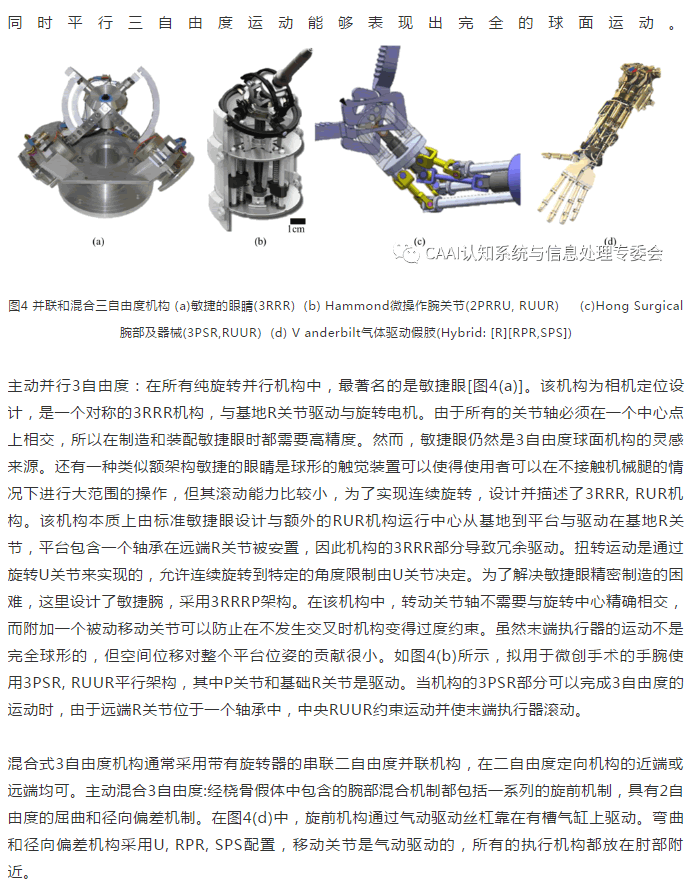 串行RRR方法在工業(yè)機(jī)械臂應(yīng)用中非常普遍。許多商用工業(yè)武器,如Kuka k -16、川崎k系列、發(fā)那科M系列、DurrEcoPaint、鴻海/ Foxconnrobot arms和巴雷特WAM[圖2(b)]。這三個關(guān)節(jié)的軸在一個共同點(diǎn)上相交球形末端執(zhí)行器運(yùn)動,并為機(jī)器人手臂更近端的關(guān)節(jié)提供平移運(yùn)動與球形手腕運(yùn)動解耦。當(dāng)兩個“滾”軸共線時,這種設(shè)計常常導(dǎo)致在零位置出現(xiàn)奇異點(diǎn)。然而,在包裝約束的運(yùn)動范圍和靈活性(輥電機(jī)和齒輪系可以放置遠(yuǎn)離旋轉(zhuǎn)中心)使這種配置吸引和適合工業(yè)武器。要注意的是,這些臂內(nèi)的俯仰和其中一個滾轉(zhuǎn)角通常是通過傘齒輪差速器驅(qū)動的,這使得電機(jī)可以沿著腕關(guān)節(jié)的縱向放置,節(jié)省空間,并可能減少轉(zhuǎn)動慣量。滾-槳-滾設(shè)計也用于類人機(jī)器人、用于衛(wèi)星服務(wù)的機(jī)器人手臂和外科機(jī)器人手腕,代替使用D二列滾動關(guān)節(jié),一些手腕設(shè)計實(shí)現(xiàn)3自由度的運(yùn)動通過滾動-傾斜-偏航配置。在這種情況下,偏航軸垂直于橫搖軸和俯仰軸,對應(yīng)于人手腕的徑向偏差。當(dāng)偏航軸與俯仰軸和滾轉(zhuǎn)軸相交時,該機(jī)構(gòu)通常被認(rèn)為是一個球形腕關(guān)節(jié),也可以被認(rèn)為是一個RU鏈。除了手術(shù)臂和工業(yè)臂,因?yàn)闈L-滾-滾手腕與人的手腕相似,所以也經(jīng)常用于人形或擬人化機(jī)械臂。一些系列腕設(shè)計選擇使用單一的球關(guān)節(jié)而不是串行鏈,雖然整體幾何形狀是一個球和窩接接頭,但球?qū)嶋H上是轉(zhuǎn)子,窩接接頭是定子。