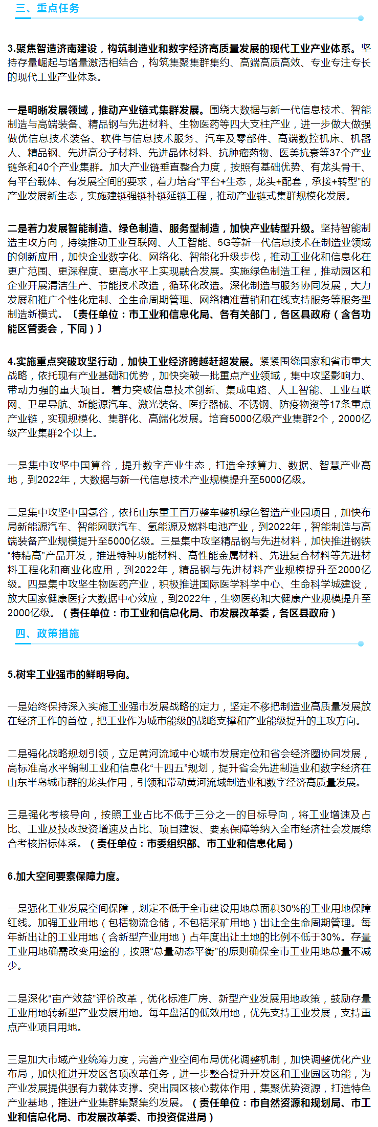 1.總體要求。堅持以新時代中國特色社會主義思想為指導,認真貫徹落實總書記對山東、對濟南工作的重要指示要求,對標對表“走在前列、多面開創(chuàng)”目標定位,按照省委省政府打造“智造濟南”工作要求,堅持新發(fā)展理念,把推動制造業(yè)G質(zhì)量發(fā)展放在經(jīng)濟工作首位,大力實施工業(yè)強市發(fā)展戰(zhàn)略,以智能制造為主攻方向,深化新一代信息技術與制造業(yè)融合發(fā)展,加快工業(yè)互聯(lián)網(wǎng)創(chuàng)新發(fā)展,加快制造業(yè)生產(chǎn)方式和企業(yè)形態(tài)根本性變革,加快構建現(xiàn)代產(chǎn)業(yè)體系。聚力打好產(chǎn)業(yè)基礎G級化、產(chǎn)業(yè)鏈現(xiàn)代化攻堅戰(zhàn),聚焦制造業(yè)優(yōu)化升級、數(shù)字經(jīng)濟引L、服務實體經(jīng)濟三大重點任務,著力培育創(chuàng)新驅動、項目帶動、政策促動三大動能,凝心聚力、持之以恒打造先進制造業(yè)和數(shù)字經(jīng)濟G質(zhì)量發(fā)展雙引擎,鞏固提升工業(yè)經(jīng)濟的支柱地位和輻射帶動作用,持續(xù)推動產(chǎn)業(yè)和城市能級雙提升,為建設“大強美富通”現(xiàn)代化國際大都市提供強大產(chǎn)業(yè)支撐。