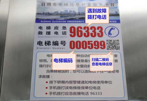 平臺對錄入的每臺電梯都進(jìn)行了準(zhǔn)確定位,并且在轎廂內(nèi)張貼標(biāo)識牌,標(biāo)識牌上有電梯應(yīng)急救援電話“96333”以及每臺電梯對應(yīng)的編號。市民乘坐電梯偶遇故障被困時(shí),可撥打“96333”救援熱線電話,告知接線人員電梯編碼,即可對所乘電梯的所在小區(qū)、單元樓實(shí)施迅速定位,安排專業(yè)人員前去救援。市民在日常乘梯時(shí)也可憑借96333應(yīng)急處置平臺的數(shù)據(jù)歸集,掃描標(biāo)識牌二維碼,獲知電梯檢驗(yàn)、維保、投保、管理等情況,參與電梯安全管理社會共治。