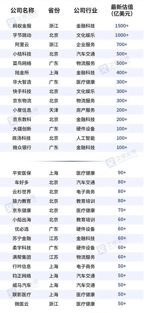 iiMedia Research(艾媒咨詢)數(shù)據(jù)顯示,2020中國(guó)新經(jīng)濟(jì)獨(dú)角獸200強(qiáng)榜單中,螞蟻金服、字節(jié)跳動(dòng)、阿里云L居前3位,估值分別突破1500億美元、1000億美元、700億美元;此外排名前10的企業(yè)依次為小桔科技、菜鳥網(wǎng)絡(luò)、陸金所、華大智造、快手科技、京東物流、小屋信息,估值均在200億美元以上;排名11-20位的企業(yè)依次為京東數(shù)科、大疆創(chuàng)新、商湯科技、微眾銀行、平安醫(yī)保、車好多、云杉世界、猿力教育、京東健康、小船出海,估值均在60億美元以上。