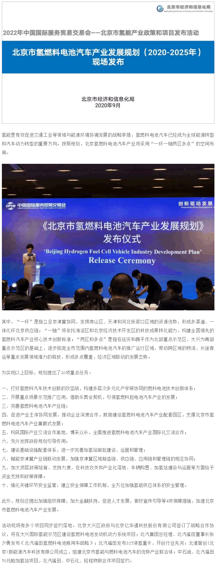 9月8日,北京市經(jīng)濟(jì)和信息化局正式發(fā)布《北京市氫燃料電池汽車產(chǎn)業(yè)發(fā)展規(guī)劃(2020-2025年)》(以下簡稱“規(guī)劃”)。規(guī)劃分兩個(gè)階段提出發(fā)展目標(biāo):2023年前,培育3-5家具有國際影響力的氫燃料電池汽車產(chǎn)業(yè)鏈龍頭企業(yè),力爭推廣氫燃料電池汽車3000輛,氫燃料電池汽車全產(chǎn)業(yè)鏈累計(jì)產(chǎn)值突破85億元;2025年前,培育5-10家具有國際影響力的氫燃料電池汽車產(chǎn)業(yè)鏈龍頭企業(yè),力爭實(shí)現(xiàn)氫燃料電池汽車?yán)塾?jì)推廣量突破1萬輛,氫燃料電池汽車全產(chǎn)業(yè)鏈累計(jì)產(chǎn)值突破240億元。