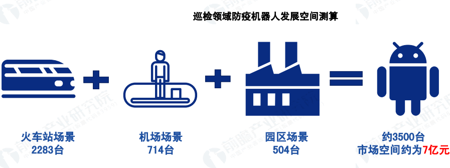 假設(shè)三等站配備1臺(tái)巡檢機(jī)器人、二等站配備2臺(tái)、一等站配備3臺(tái)、特等站配備4臺(tái)、民航機(jī)場(chǎng)配備3臺(tái)、每個(gè)園區(qū)配備3臺(tái),巡檢L域防疫機(jī)器人的需求量約為3500臺(tái)。按照每臺(tái)機(jī)器人20萬元的價(jià)格計(jì)算,巡檢L域防疫機(jī)器人的市場(chǎng)空間約為7億元。