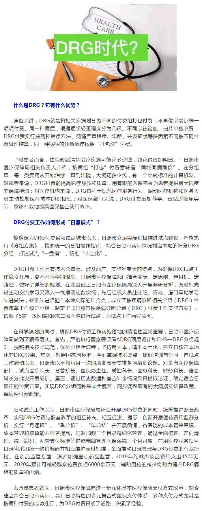 一直以來,傳統(tǒng)的“按項目付費”方式被認(rèn)為是導(dǎo)致過度醫(yī)療、大處方的重要原因之一,在浪費醫(yī)療資源的同時也加重了老百姓就醫(yī)負(fù)擔(dān),呼吁改革的聲音不斷。為健全醫(yī)保支付機制,激發(fā)醫(yī)療機構(gòu)規(guī)范行為、控制成本的內(nèi)生動力,去年5月,國家醫(yī)保局啟動按疾病診斷相關(guān)分組(DRG)付費試點,山東省在組織青島市參加國家試點的同時,首批選取10個市開展DRG付費省級試點,日照市位列其中。