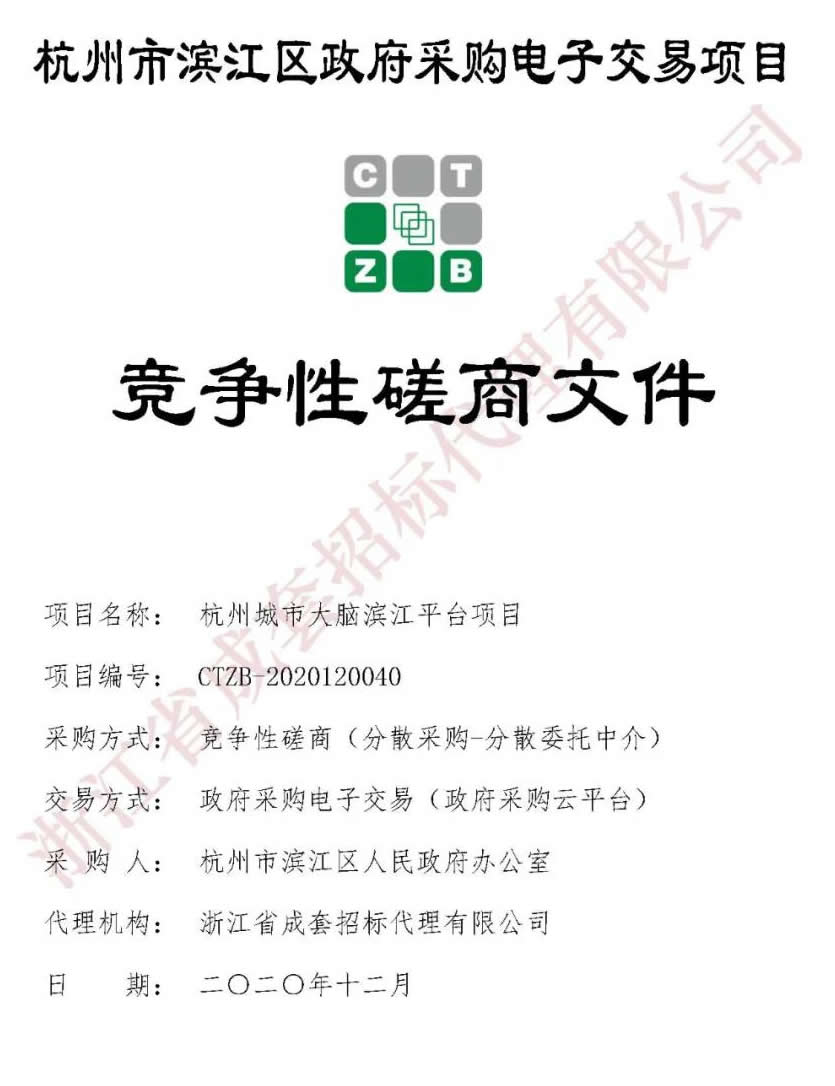 項目編號:CTZB-2020120040,項目采購內(nèi)容為杭州市濱江區(qū)人民政府辦公室所需的杭州城市大腦濱江平臺,主要內(nèi)容包括杭州城市大腦濱江平臺相關(guān)的數(shù)字樞紐基礎(chǔ)能力平臺軟硬件租賃服務(wù)、運維服務(wù)