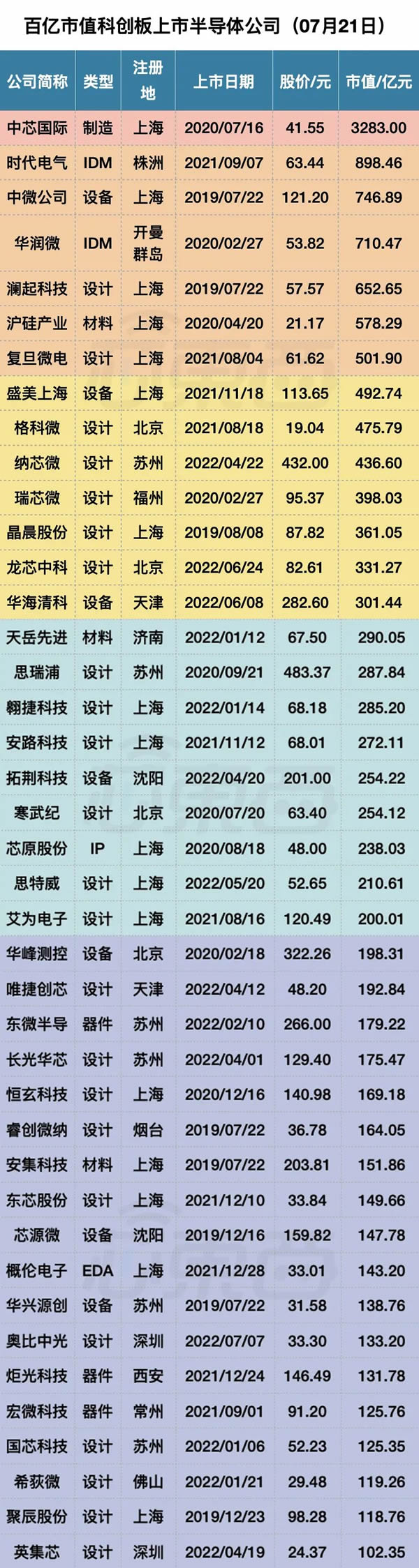 科創(chuàng)板已上市的半導(dǎo)體相關(guān)企業(yè)共70家,約占科創(chuàng)板上市公司數(shù)量的16.0%,總市值達(dá)1.70萬(wàn)億元,約占科創(chuàng)板總市值的30.4%,39家科創(chuàng)板上市芯片設(shè)計(jì)企業(yè)