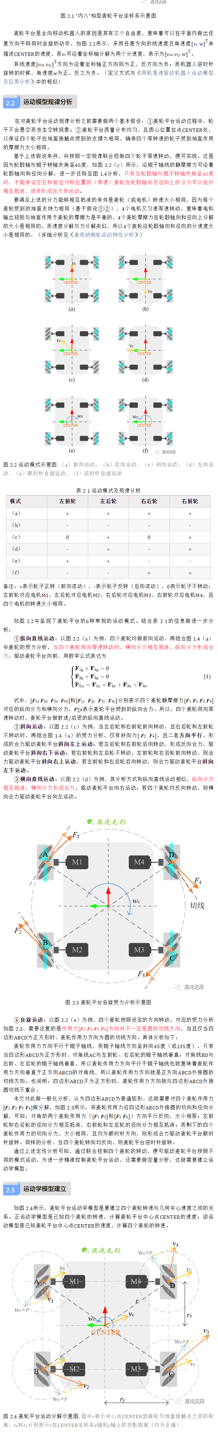 麥克納姆輪平臺因其優(yōu)異的機(jī)動性而備受關(guān)注,本文深入分析麥克納姆輪的運(yùn)動機(jī)理及其麥輪平臺運(yùn)動過程中的受力情況,先后分析麥輪平臺的6種運(yùn)動模式及其內(nèi)在運(yùn)動規(guī)律;并采用速度分解的方法,詳細(xì)分析了電機(jī)轉(zhuǎn)速-麥輪實際運(yùn)動速度-麥輪平臺中心點(diǎn)速度之間的關(guān)系,給出完整的物理分析及數(shù)學(xué)推導(dǎo)過程,構(gòu)建麥輪平臺的運(yùn)動學(xué)模型;后從速度空間、運(yùn)動效率等方面分析麥輪平臺的適用場景。