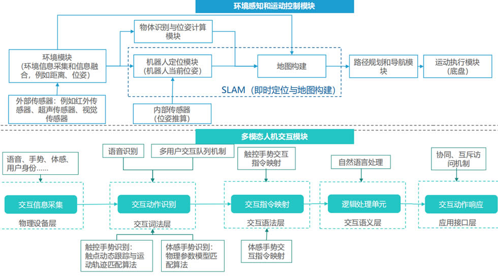 環(huán)境感知與導航是指機器人通過傳感器獲取外界環(huán)境及自身信息;運動控制器是服務機器人行動的執(zhí)行者;人機交互技術(shù)是實現(xiàn)服務機器 人與人溝通的橋梁